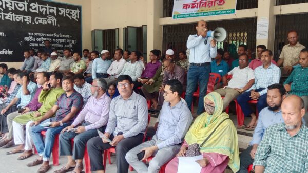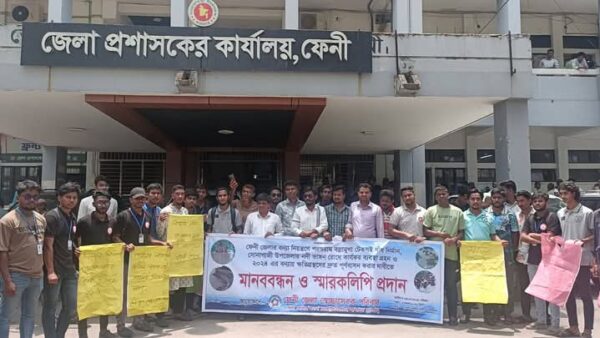 ফেনী জেলার বন্যা নিয়ন্ত্রণ ও টেকসই বাঁধ নির্মাণের দাবিতে মানববন্ধন ও স্মারকলিপি প্রদান