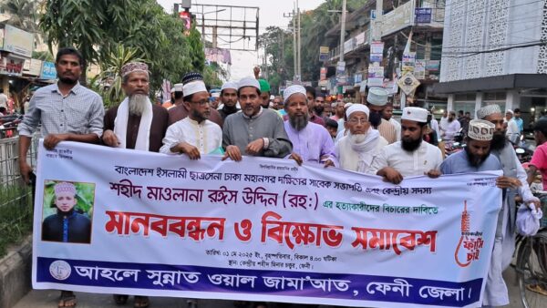 গাজীপুরে মাওলানা রইস উদ্দিনের হত্যাকারীদের গ্রেফতারের দাবীতে ফেনীতে বিক্ষোভ মিছিল
